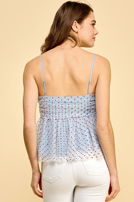 A spaghetti strap, A-Line top. Featuring a ruffle hem and mini heart detailing throughout top.