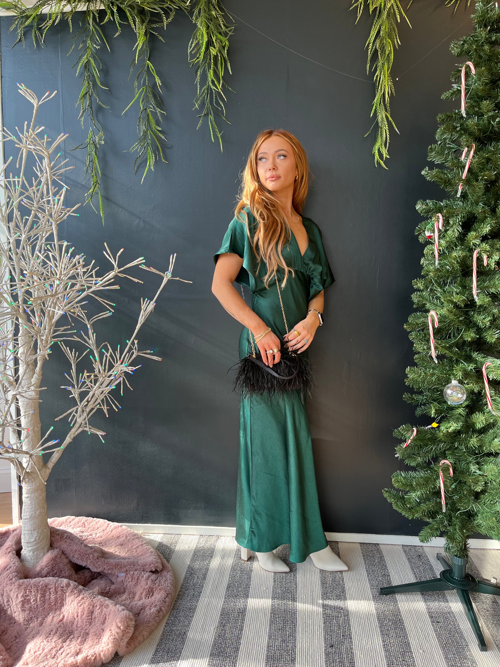 The CLAUDIA DRESS is a maxi dress in satinette with flutter sleeves and a v-neck.